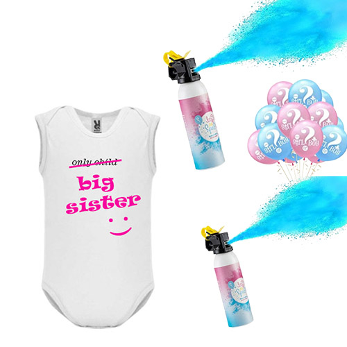 Acest set gender reveal este alegerea perfectă pentru a anunța într-un mod spectaculos venirea pe lume a unui băiețel! Pachetul conține 2 spray-uri albastre, care eliberează un nor intens de culoare pentru un efect vizual impresionant, 20 de baloane gender reveal în nuanțe de roz și albastru, adăugând mister și emoție petrecerii, și un body personalizat „Big Sister”, ideal pentru a sărbători micuța care urmează să devină sora mai mare. Fiecare element este atent ales pentru a transforma acest moment special într-o amintire de neuitat, plină de bucurie și surpriză pentru toți cei dragi.