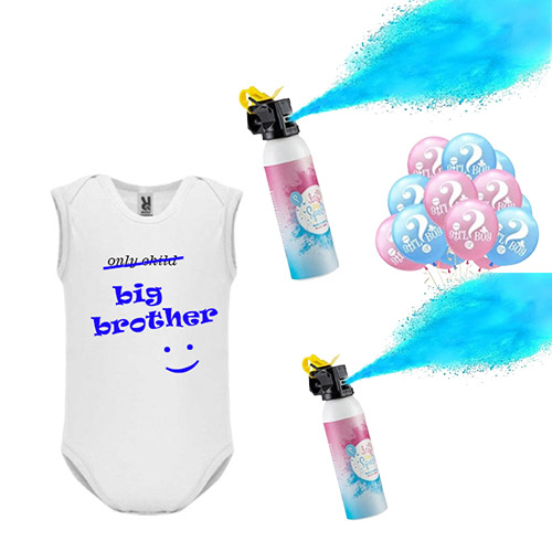 Un set perfect pentru gender reveal: spray-uri cu praf albastru, baloane speciale si un body Big Brother, toate pregatite pentru o surpriza de neuitat.