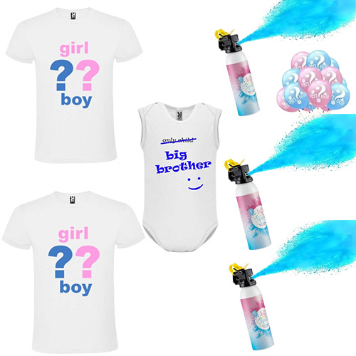 Set gender reveal cu 3 sprayuri albastre, body Big Brother, 2 tricouri pentru parinti si baloane tematice. Perfect pentru anuntul sosirii unui baietel.